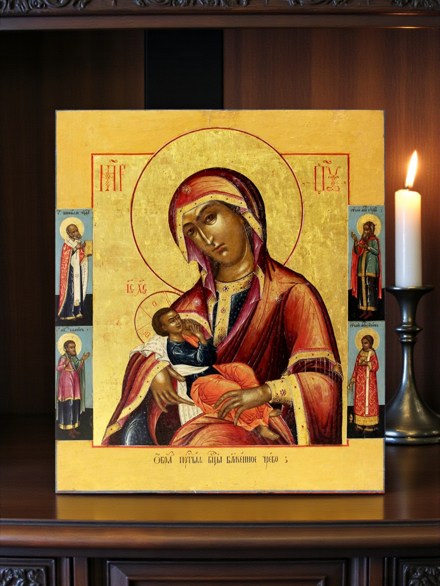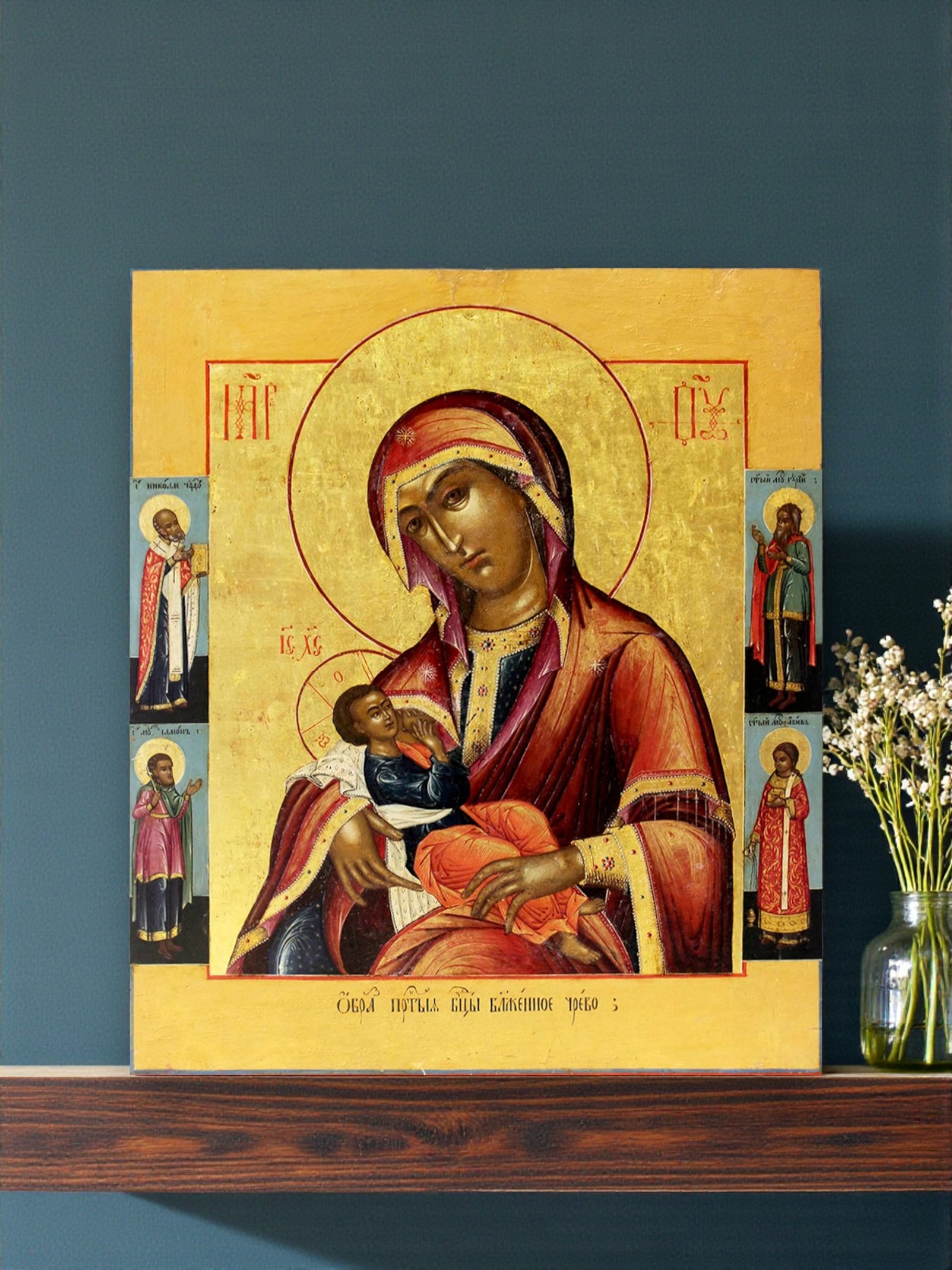 На полях этой иконы XIX века изображены предстоящие святые: Святитель Николай Чудотворец (покровитель детей и семей) и святые мученики Самон, Гурий и Авив (известные как защитники брака и семейной жизни).