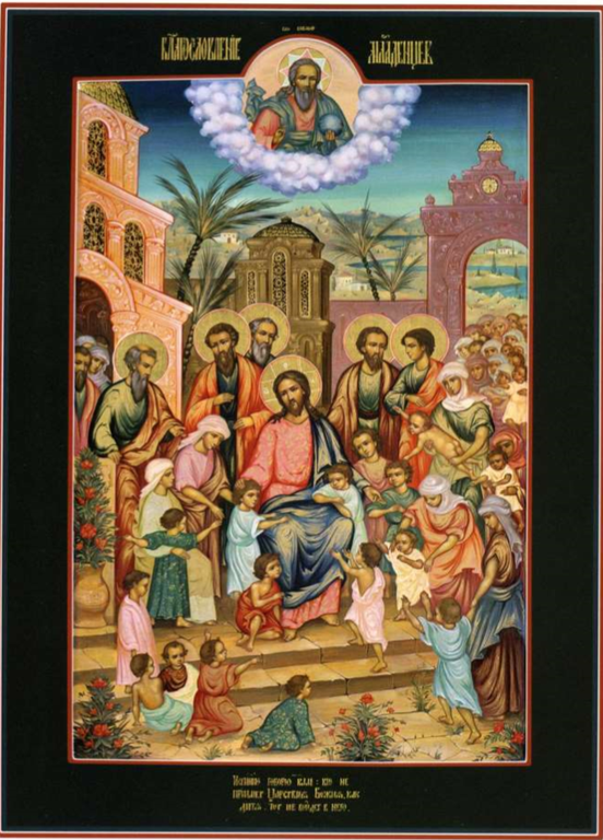 Икона «Благословение детей» дает почувствовать символичность этого события, показывает глубинную связь человеческой души с Богом, Который принимает каждого просто и с любовью, как ребенка.