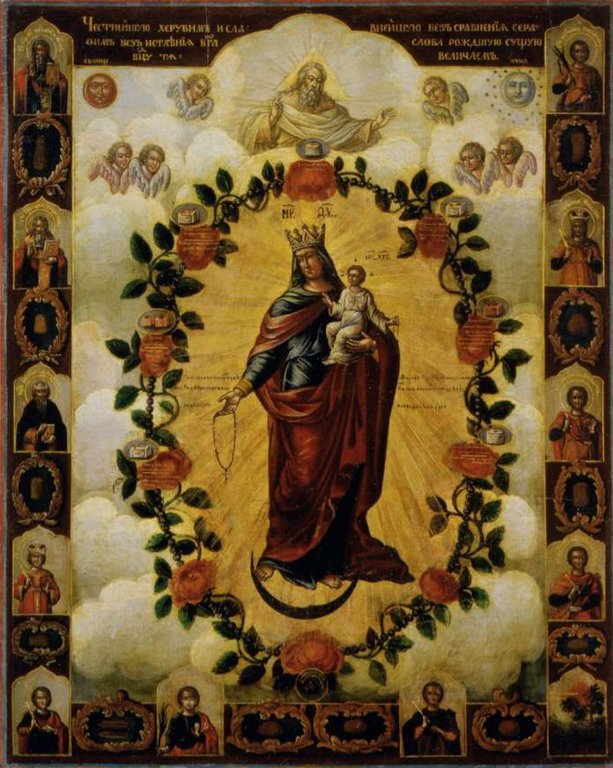 Особенно выделяется изображение Богоматери «Честнейшая Херувим и Cлавнейшая Cерафим», представленной как Царица Неба в окружении бесплотных ангельских сил.