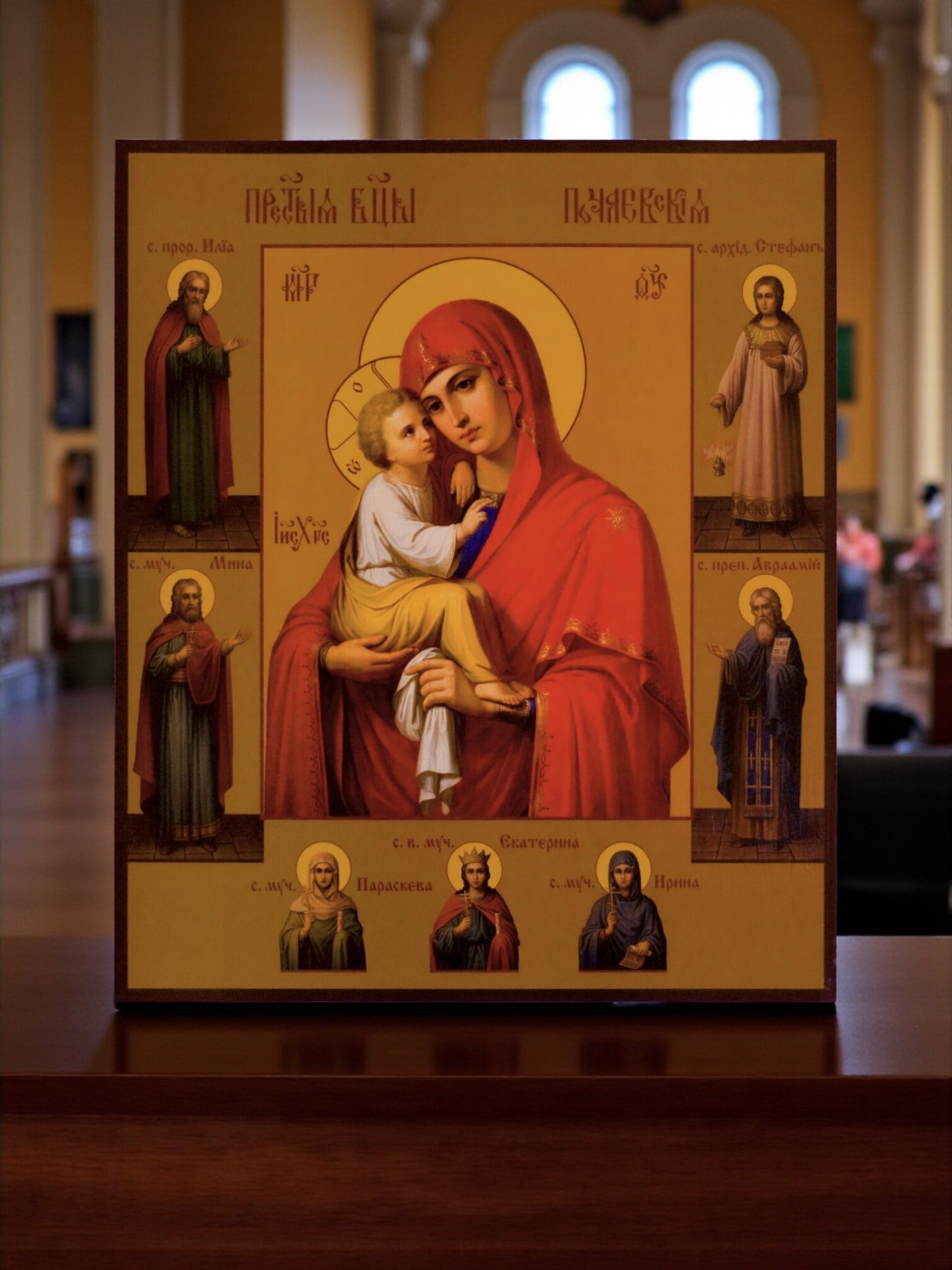 Этот священный образ XIX века украшен изображениями семи великих святых на полях: пророка Илии — ревнителя веры и чудотворца, первомученика архидиакона Стефана, мученика Мины — защитника обиженных, преподобного Авраамия — подвижника и молитвенника, святых мучениц Параскевы, Екатерины и Ирины — образцов христианского мужества и верности Христу.