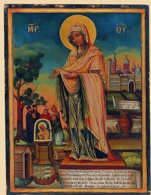 Эта икона Богородицы является покровительницей пожилых людей. На ней богородица изображена как старица ("Геронтисса").
