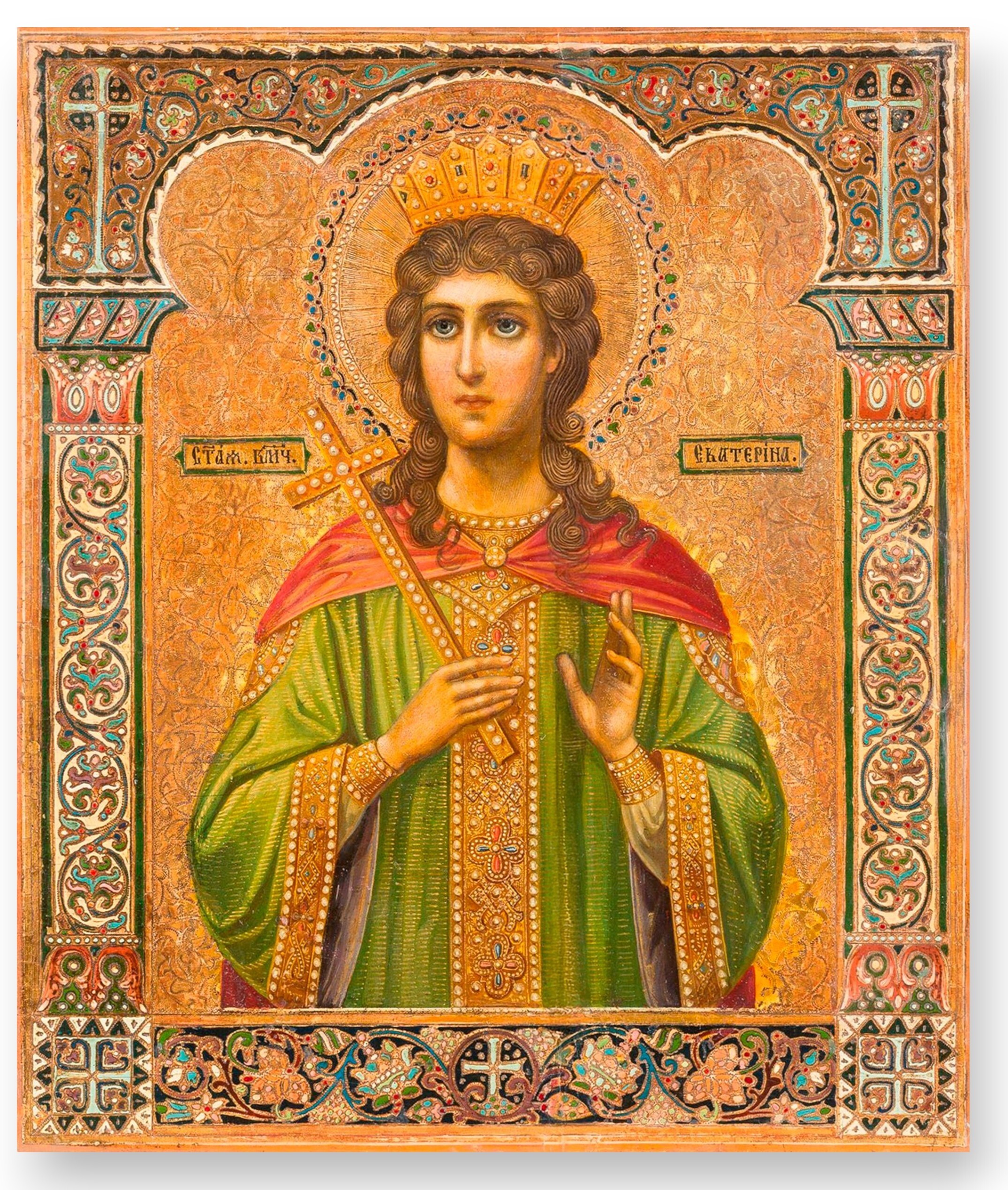 Святая Великомученица Екатерина была дочерью правителя Александрии Египетской во время правления императора Максимина (305–313 гг.). Живя в столице эллинской учёности, она обладала редкой красотой и блестящим умом, изучив произведения лучших античных философов и учёных. Юноши из самых знатных семейств империи искали её руки, но святая объявила, что выйдет замуж лишь за того, кто превзойдёт её в знатности, богатстве, красоте и мудрости.
