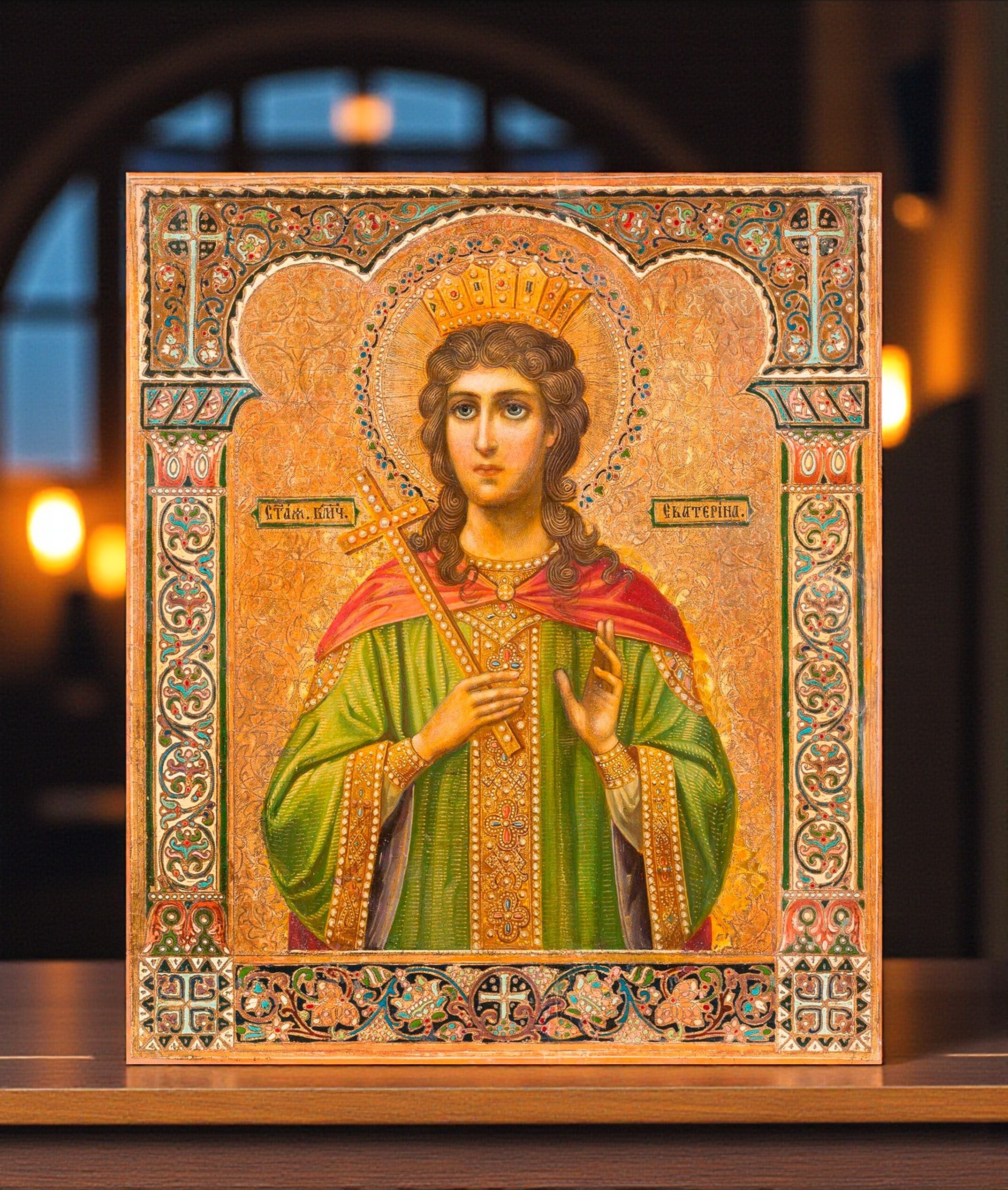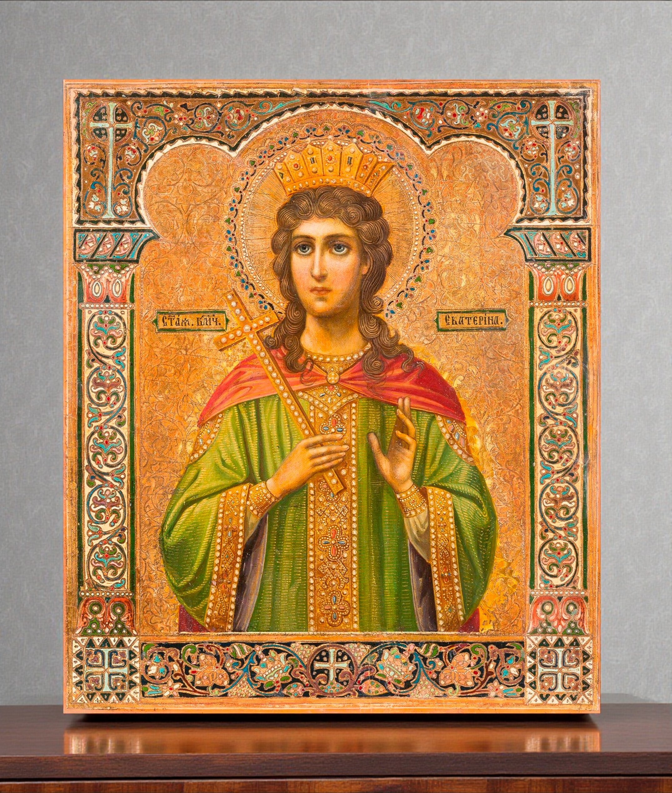 Эта прекрасная православная икона изображает Святую Великомученицу Екатерину Александрийскую — одну из самых почитаемых святых христианского мира, прославленную своей мудростью, чистотой и непоколебимой верой во Христа.
