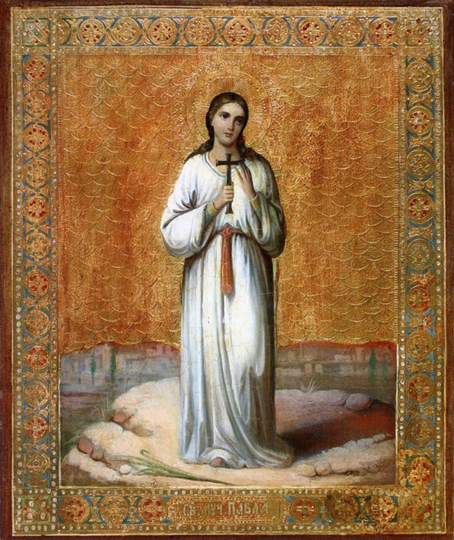 На этой иконе святая мученица Павла изображена как чистая и стойкая свидетельница Христова — юная дева, чья жизнь явила собой пример милосердия, мужества и несокрушимой веры. К её помощи прибегают в следующих нуждах: