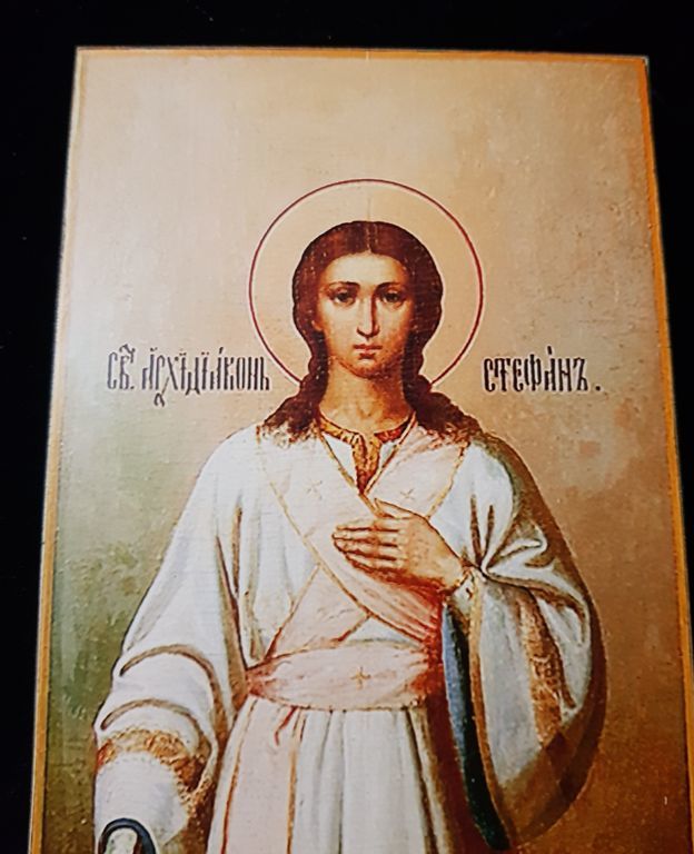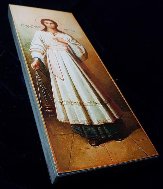 На этом святом образе изображен святой апостол Стефан, Первомученик и первый Архидиакон Церкви, муж, исполненный непоколебимой веры, Божественной премудрости и пламенной любви ко Христу. Святой Стефан родился среди эллинистических иудеев — тех, кто жил вне Святой Земли и был воспитан в греческой культуре. После сошествия Святого Духа на апостолов первохристианская община быстро росла, и апостолы избрали семь исполненных веры мужей, чтобы заботиться о вдовах, сиротах и нищих. Стефан, выделявшийся чистотой сердца и даром проповеди, стал Архидиаконом, первым среди них.