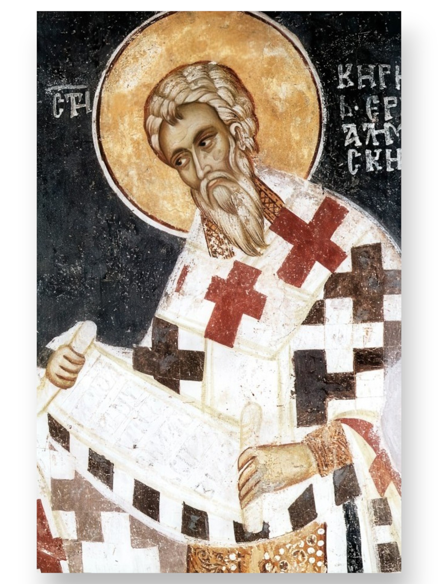 Отец Церкви, епископ Иерусалимский (350—386), аскет, проповедник, который пытался поднять значение Иерусалима в качестве центра всей христианской церкви. Иерусалим в то время находился в подчинении у митрополита Кесарийского, что вовсе не устраивало св. Кирилла. Трижды его смещали по инициативе кесарийского епископа Акакия, который требовал от Кирилла принять арианство. По случаю небесного знамения — видения Креста Господня в небе над Иерусалимом в праздник Пятидесятницы в 351 году Кирилл отправил «Послание к благочестивому царю Констанцию». Кирилл потратил много сил на умиротворение иерусалимской паствы и борьбу с еретиками, против которых подписал осуждение на II Вселенском соборе.