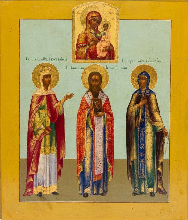 Икона Великомученицы Екатерины, Игнатия Богоносца и Преподобномученицы Евдокии с Божией Матерью «Одигитрия»