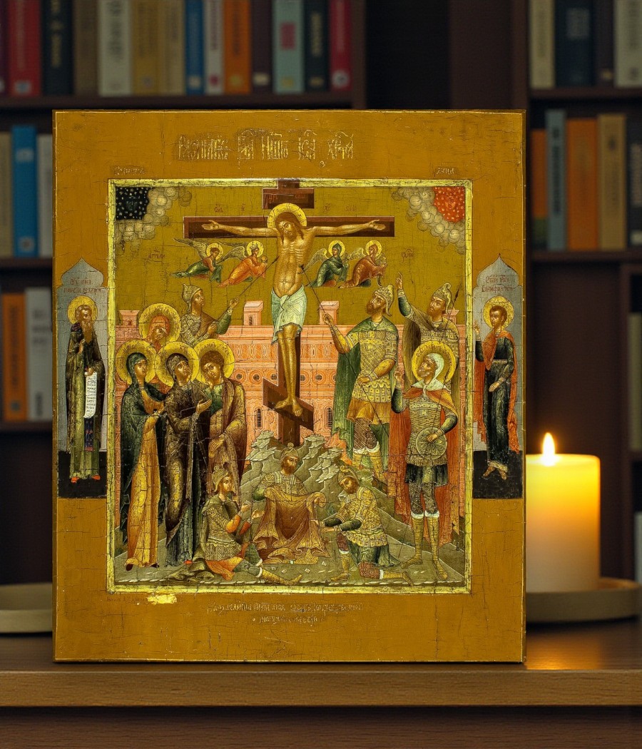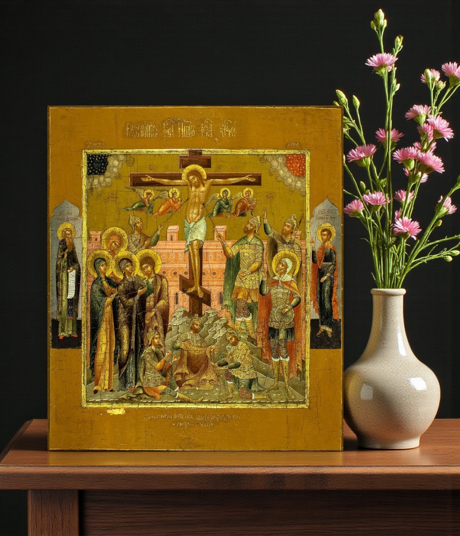По бокам от Креста на иконе Изображены Дева Мария и апостол Иоанн, который после казни, по велению Божьему, заботился о ней до самой смерти как о родной матери. Рядом: Мария Магдалина, сотник Лонгин – римский воин, который пронзил бок распятого Иисуса. Церковь чтит его как мученика, и на иконе он появляется с нимбом.