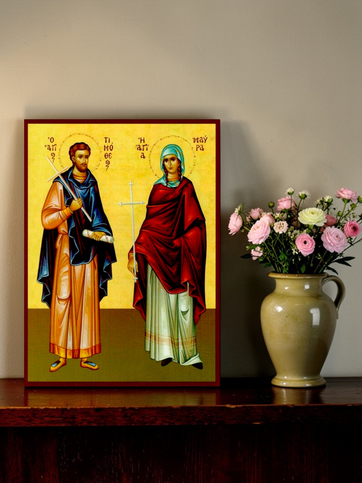 Эта икона почитает святых мучеников Тимофея и Мавру — молодую христианскую пару, которая предпочла смерть вместе, нежели предательство Христа. Их история является одним из самых трогательных свидетельств супружеской любви, преображенной и усовершенствованной через мученичество — доказательством того, что истинный христианский брак соединяет супругов не только в жизни, но и в вечном свидетельстве о Евангелии.