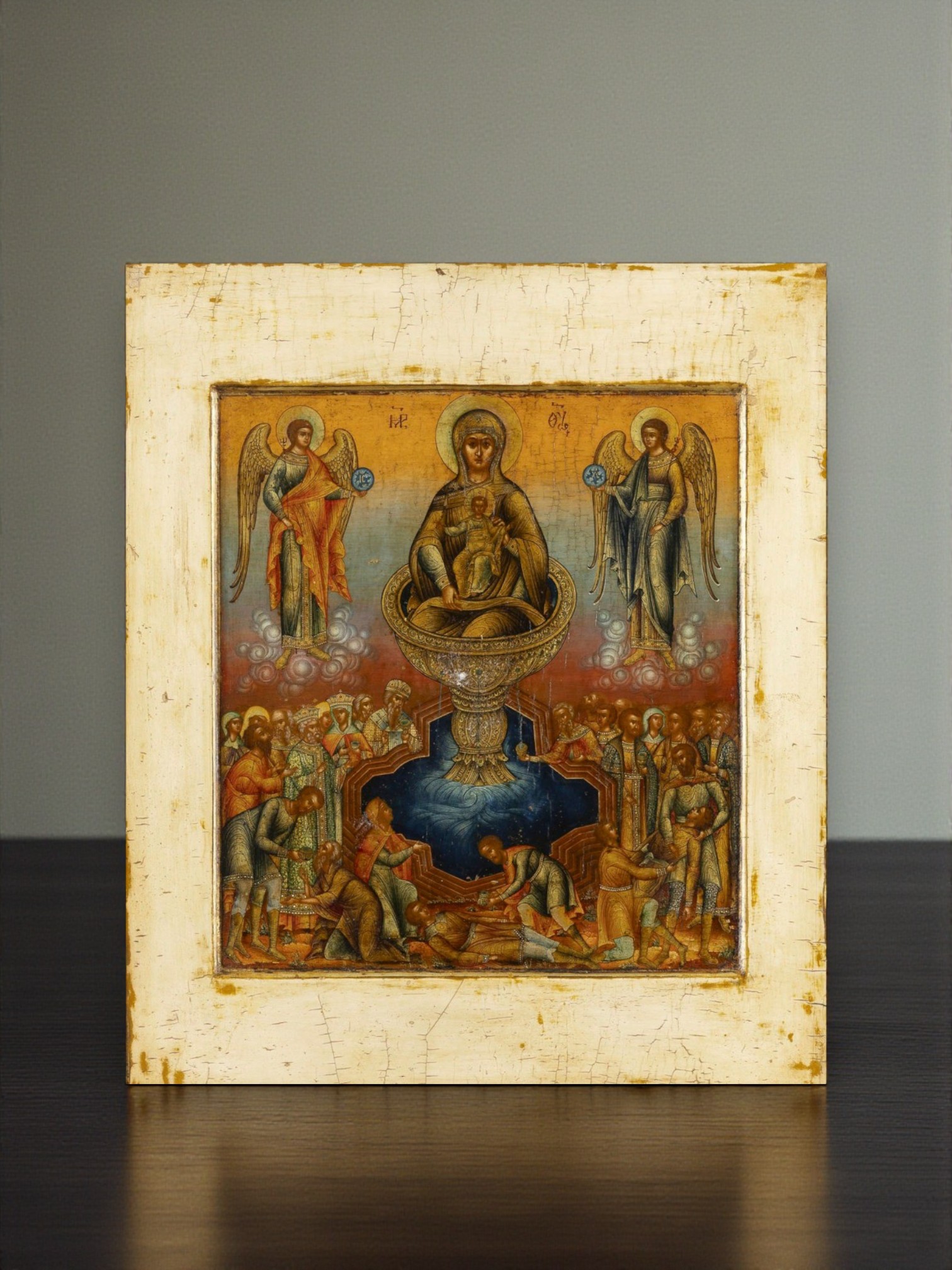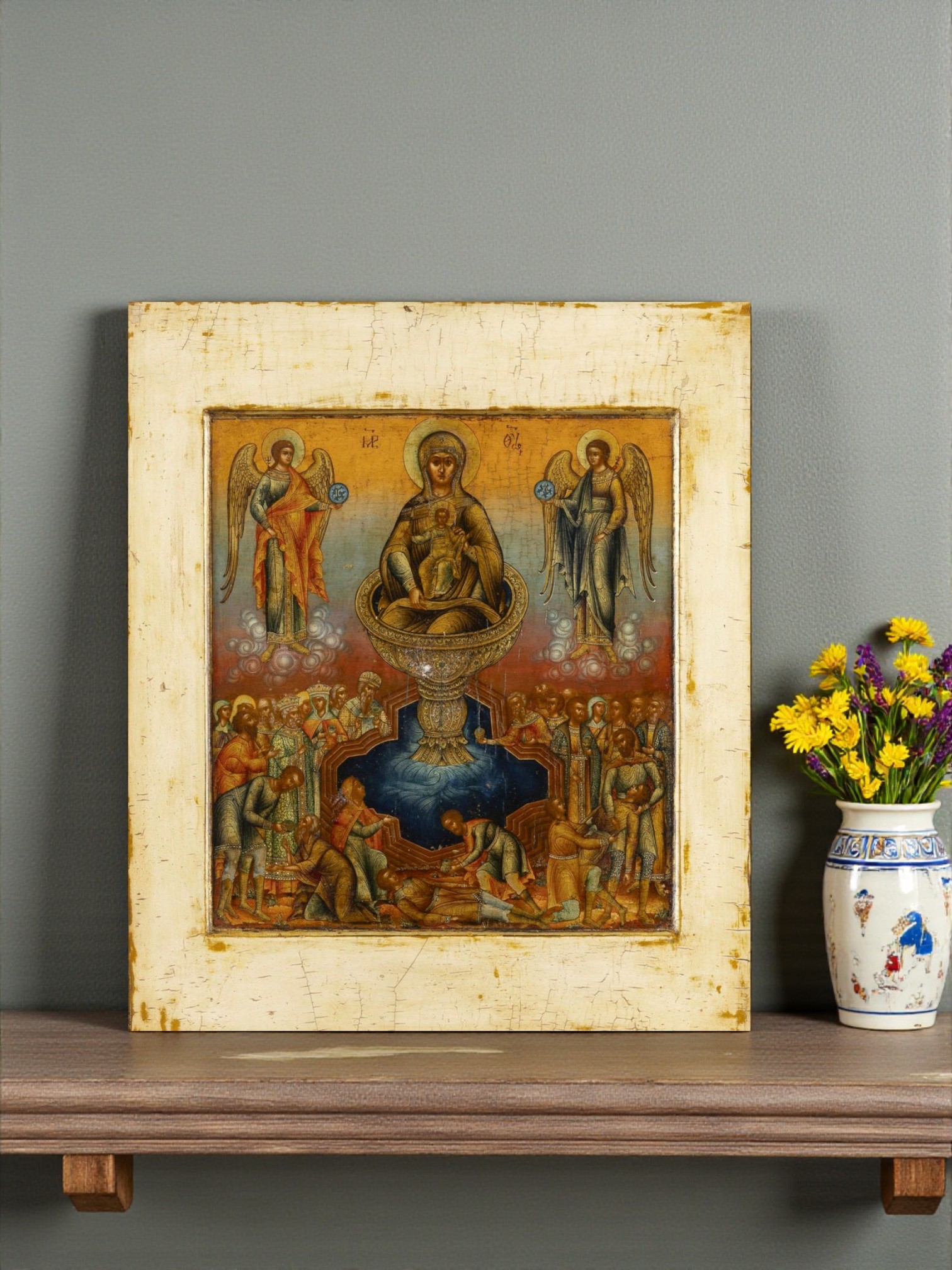 Эта православная икона изображает Божию Матерь «Живоносный Источник» — один из самых древних и чудотворных образов Пресвятой Богородицы, связанный с исцелением от болезней и подаянием живой воды благодати. Икона создана около 1900 года в прославленной московской мастерской иконописца Михаила Ивановича Дикарева, чьи работы отличались высоким художественным мастерством и глубокой духовностью.
