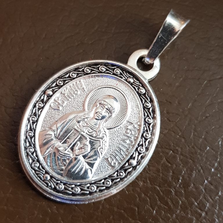 Изготовлена из мельхиора, с покрытием серебром и декоративной эмалью. Подходит для повседневного ношения, не боится влаги. Это не оберег, а икона — возможность обратиться к святой в любое время с молитвой, благодарностью или просьбой.