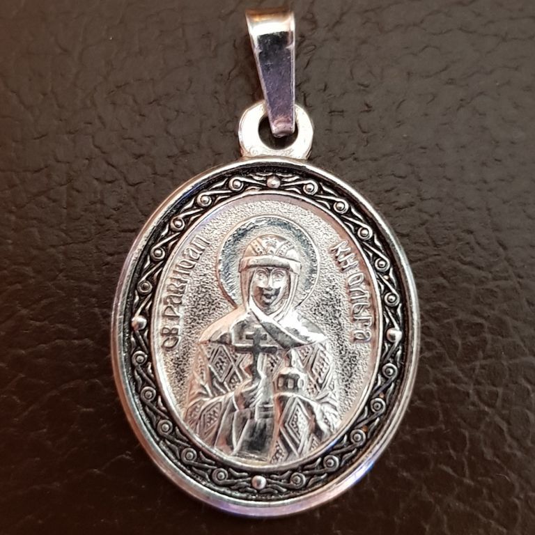 Православная нательная икона со святой Ольгой — символ духовной поддержки и памяти о своём небесном покровителе. На оборотной стороне размещена молитва. Икона освящена.