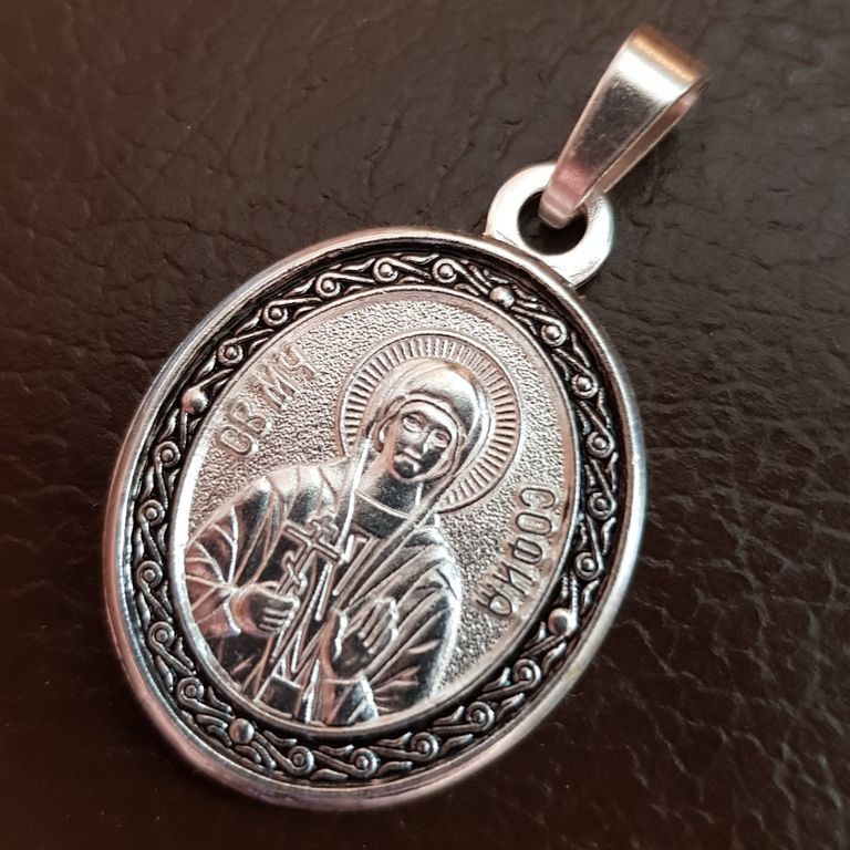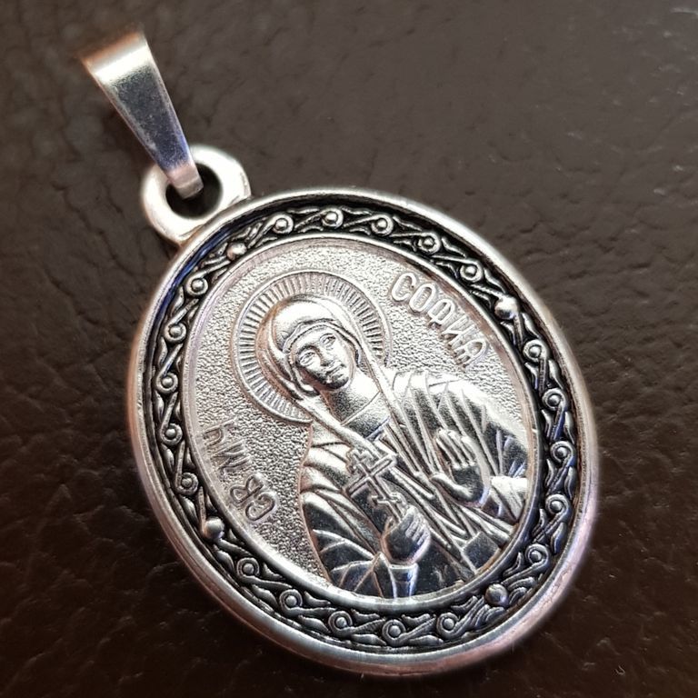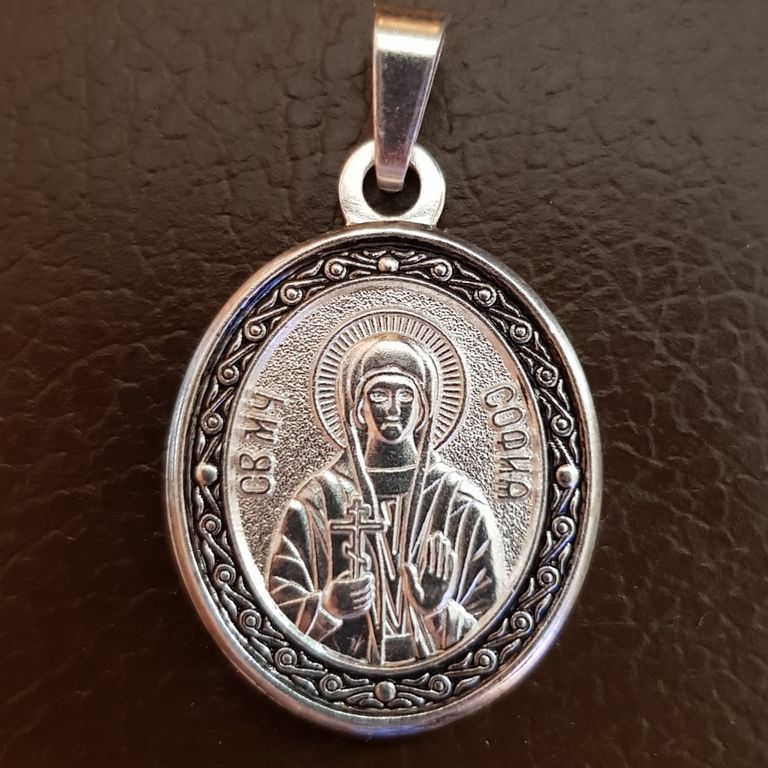 Православная нательная икона со святой Софией — символ духовной поддержки и памяти о своём небесном покровителе. На оборотной стороне размещена молитва. Икона освящена.