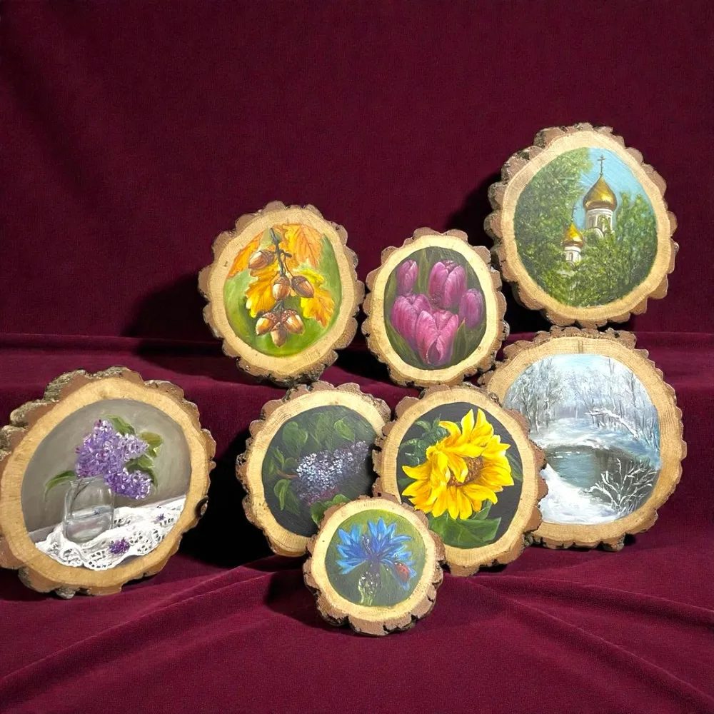 Диаметр картины - около 21 см, толщина дубового среза - 3 см.