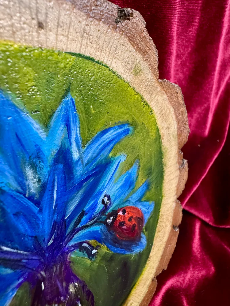 ✨ МАГИЯ ДЕТАЛИ: Насыщенный василек, написанный чистейшим лазуритом, гордо возвышается на фоне сочной зелени. А крошечная божья коровка, притаившаяся на лепестке, — это секретный знак, символ удачи и божьего благословения, который хочется разглядывать снова и снова.
