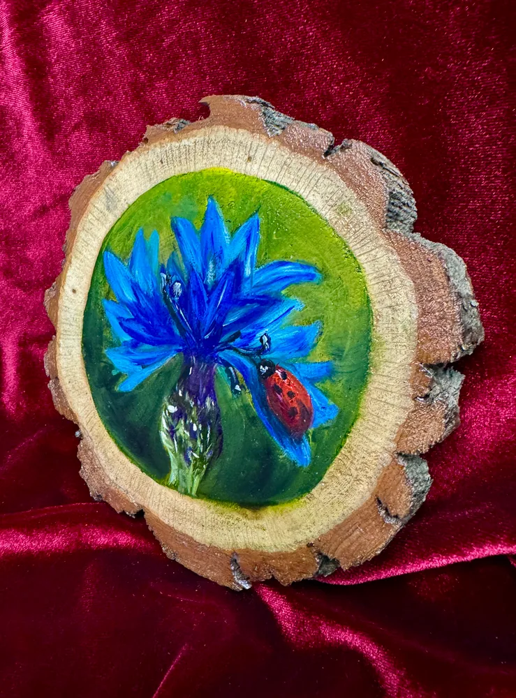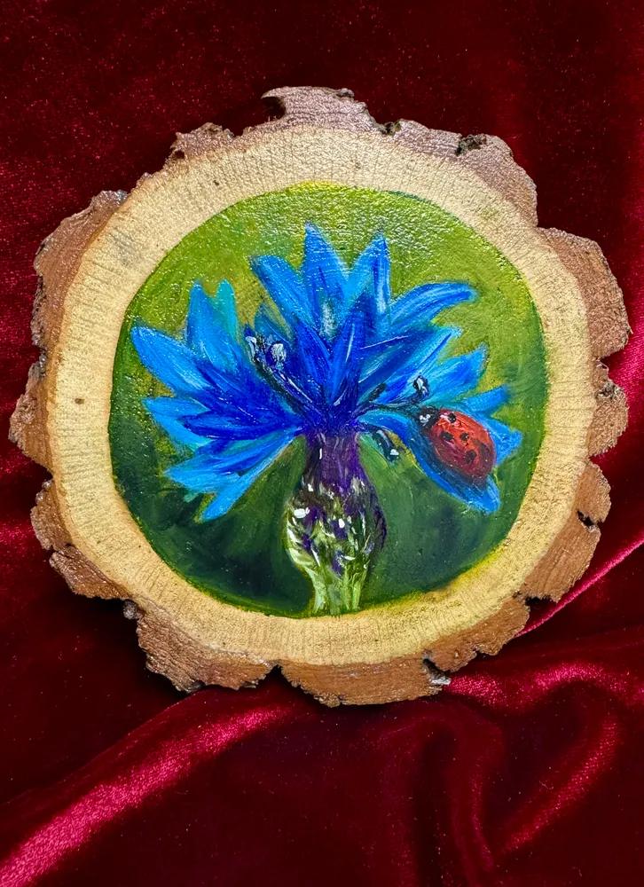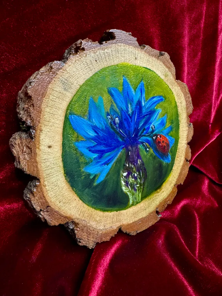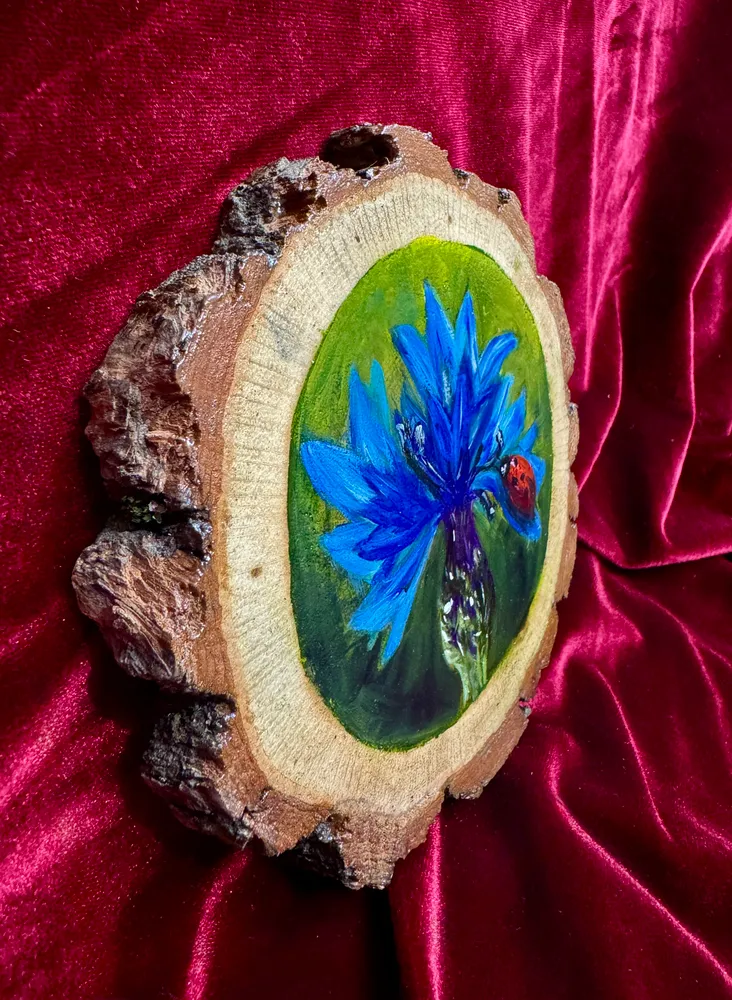 Картина «Василек» на срезе дуба с корой | Автор: Ефимова Ольга