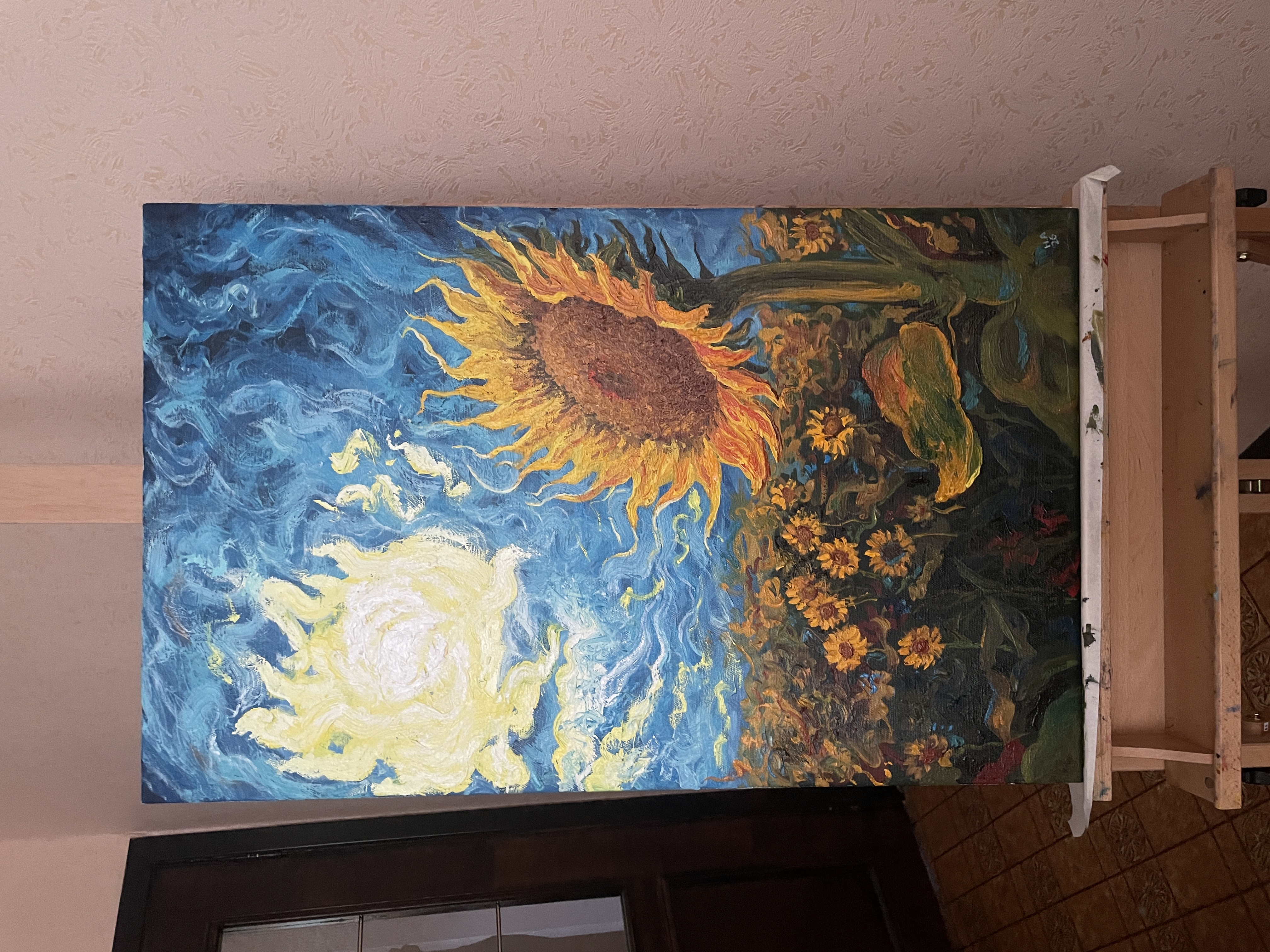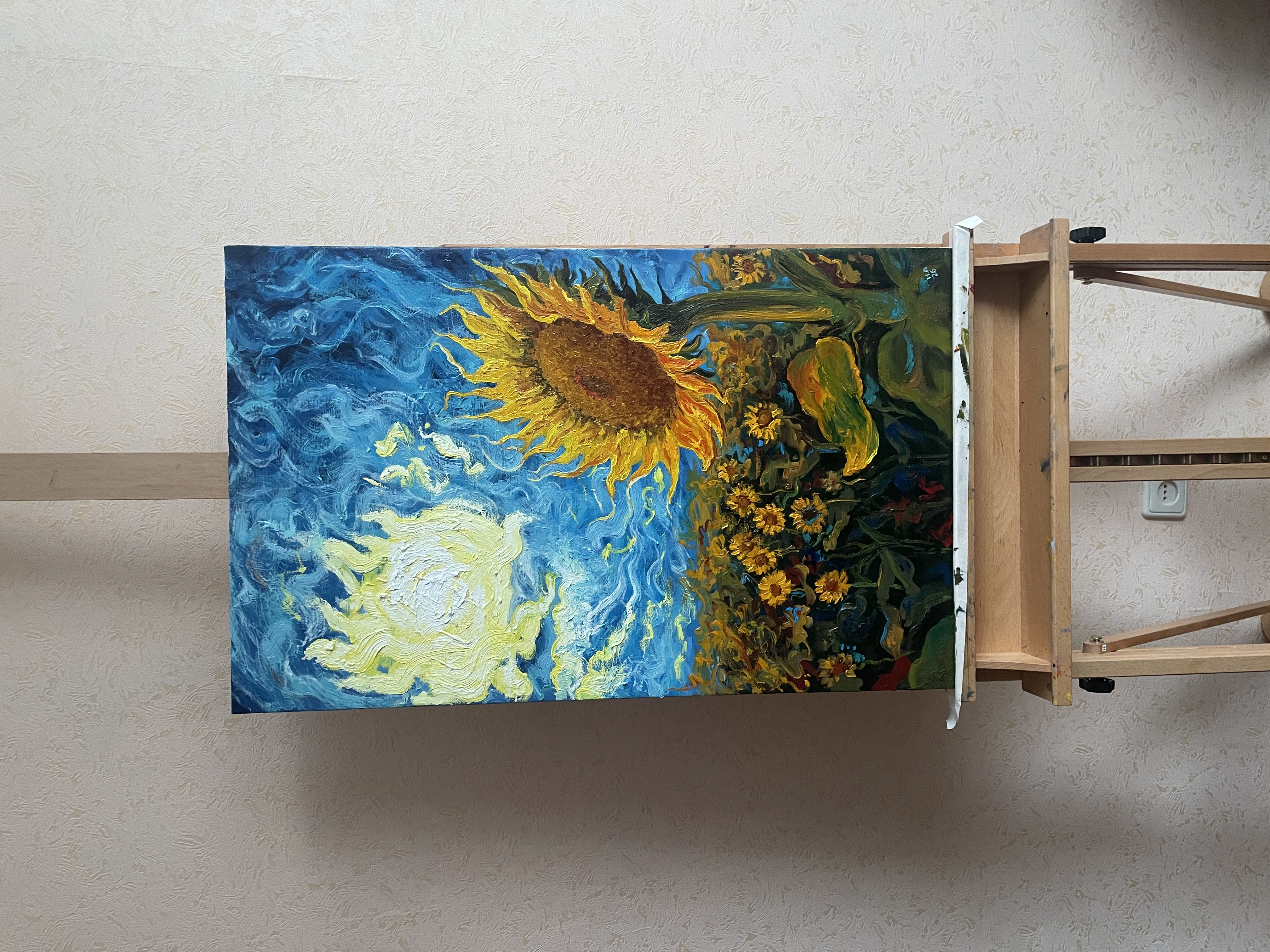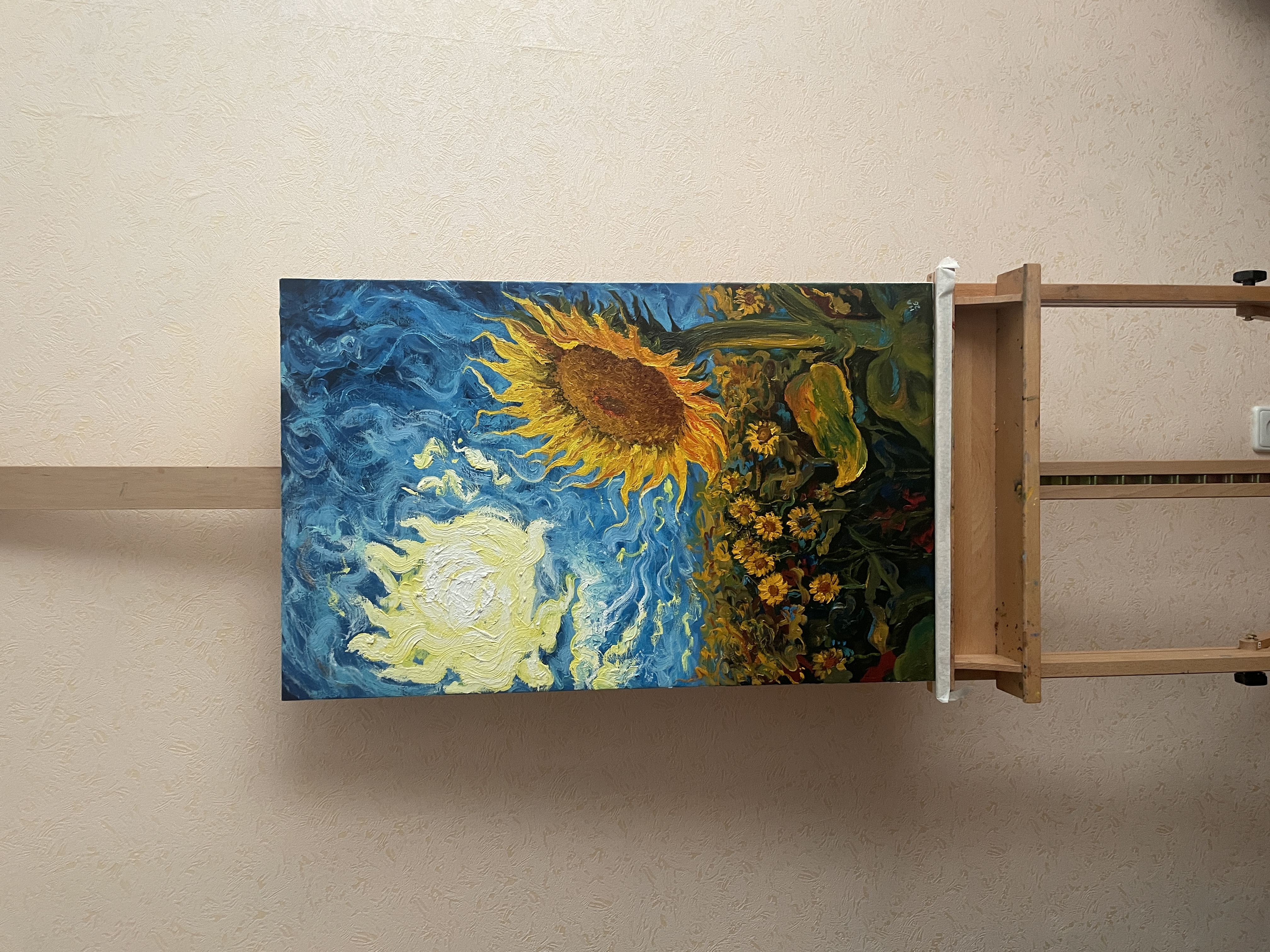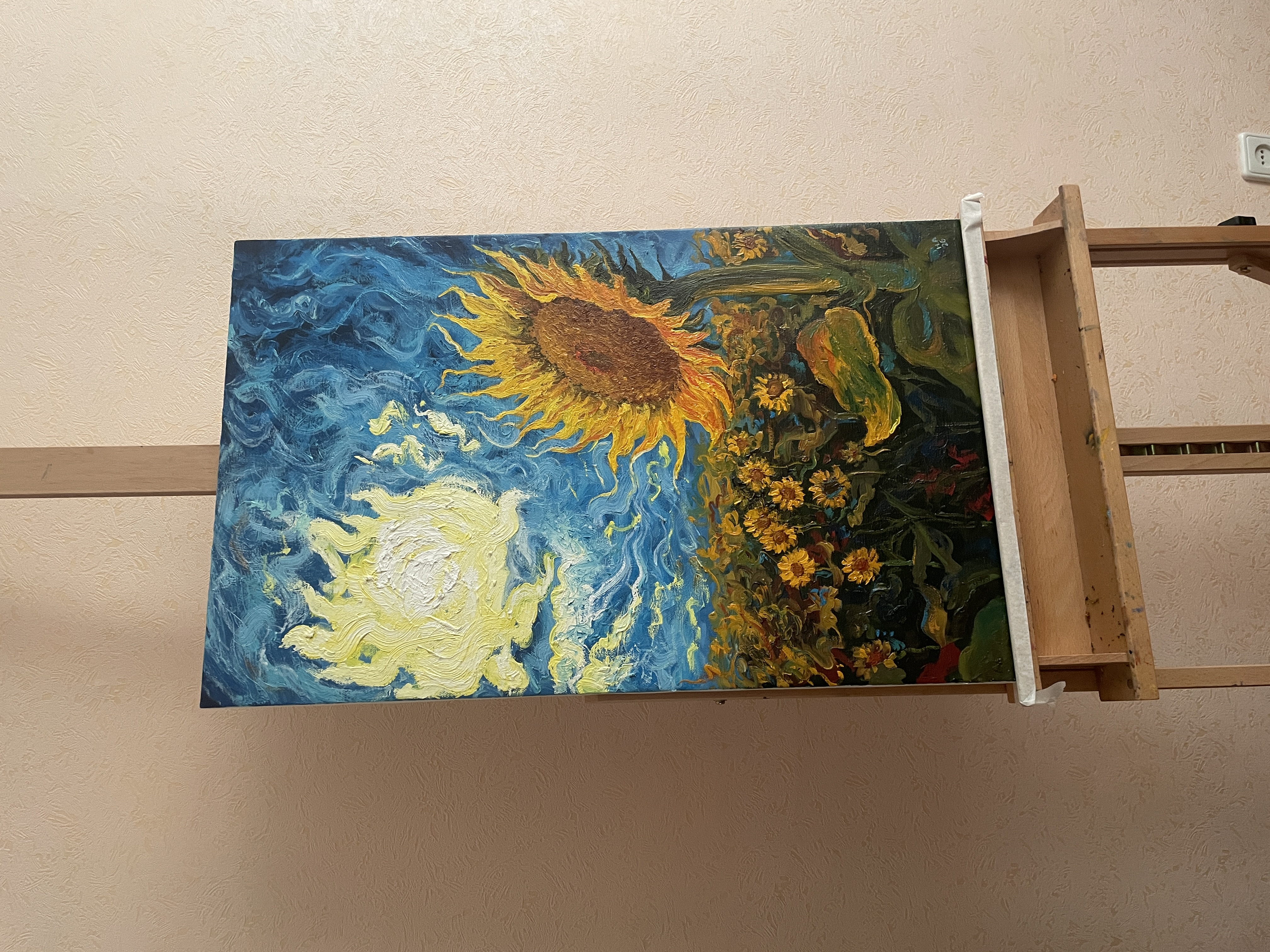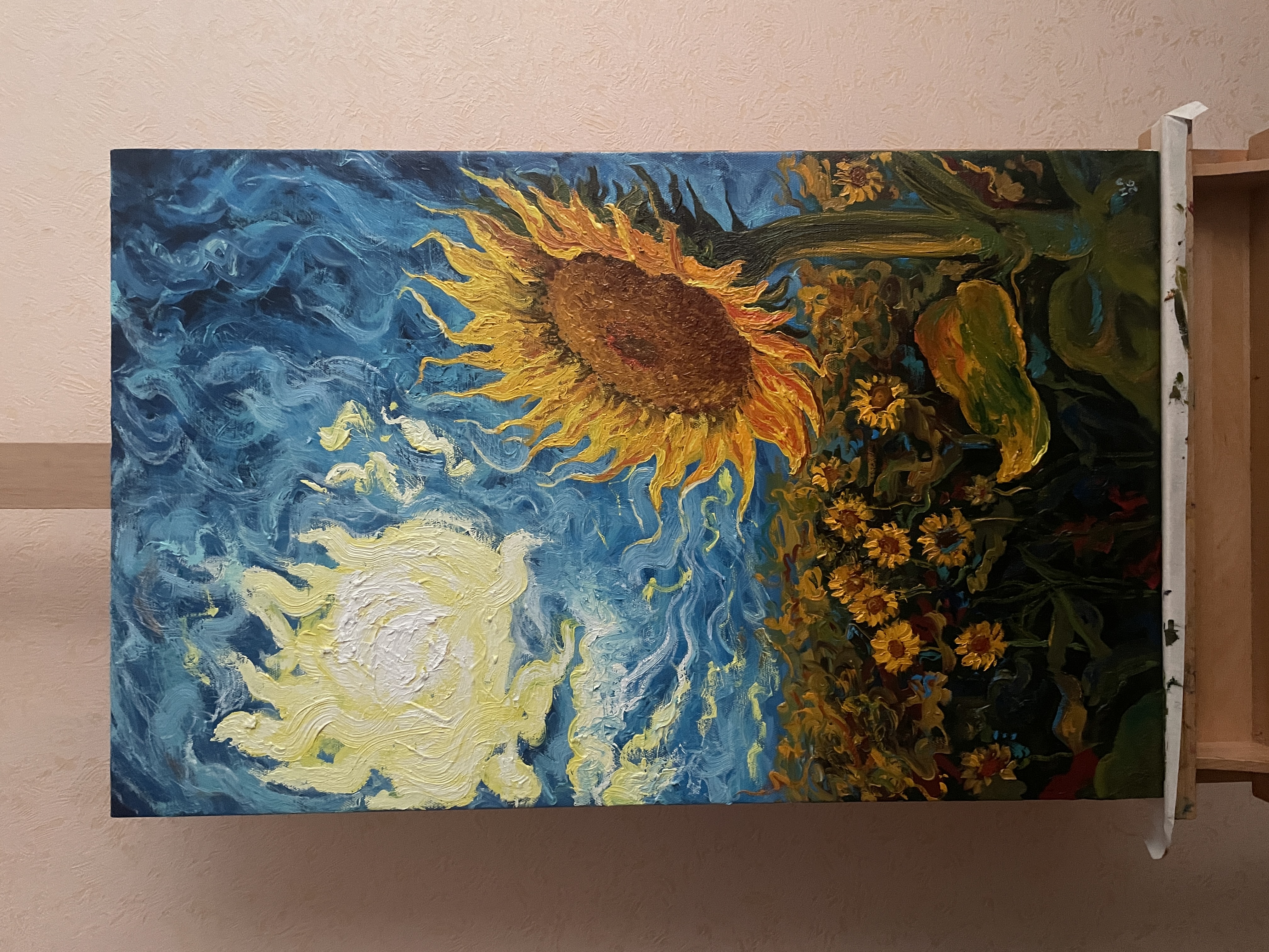 В данной работе сплошной день солнца - как одного небесного светила, так и целого поля подсолнухов. Они тянутся друг к другу и освещают собой всё вокруг. Вся атмосфера пребывает в непрерывном движении, будто дышит своей жизнью и позволила нам себя лицезреть.