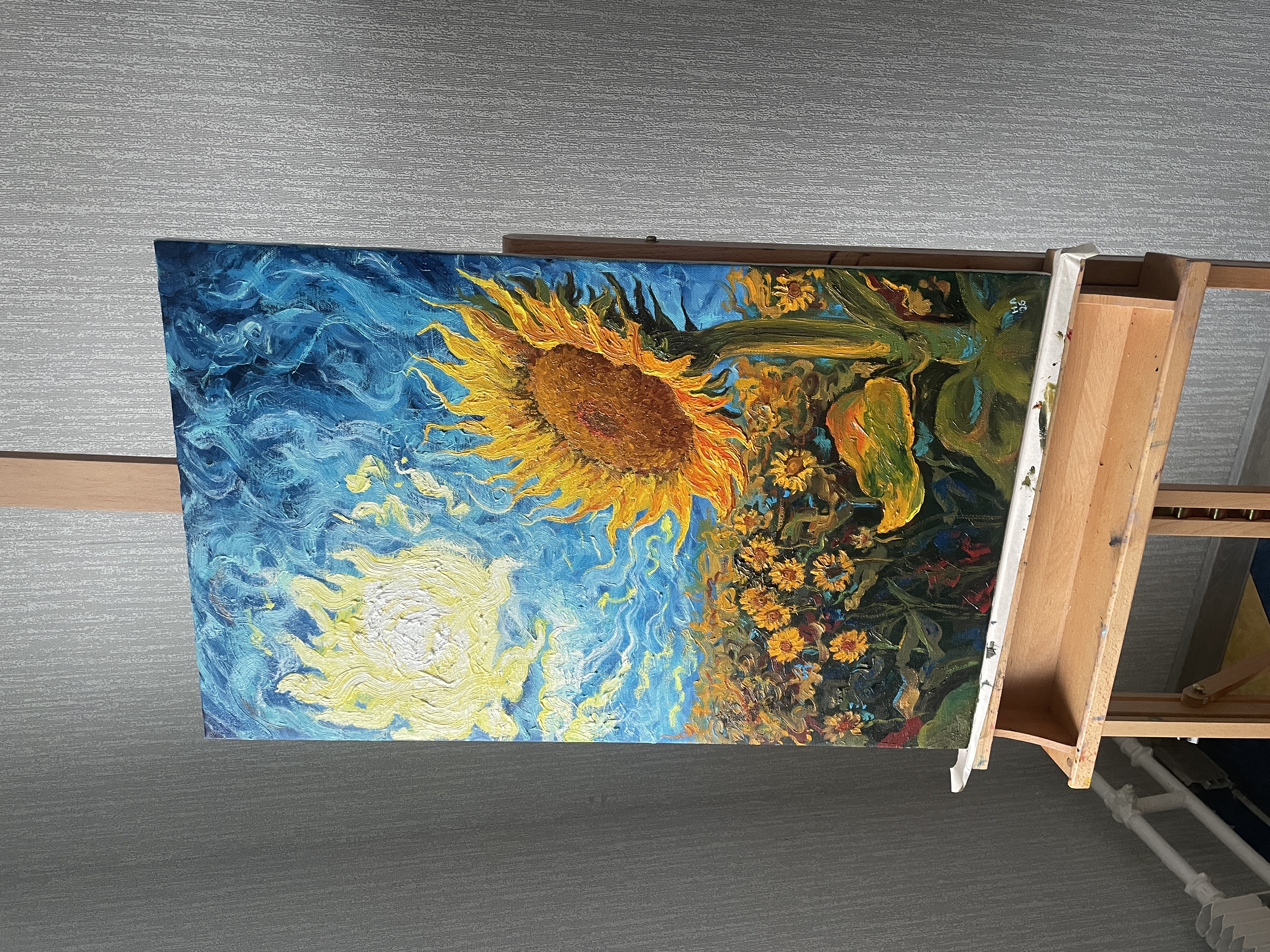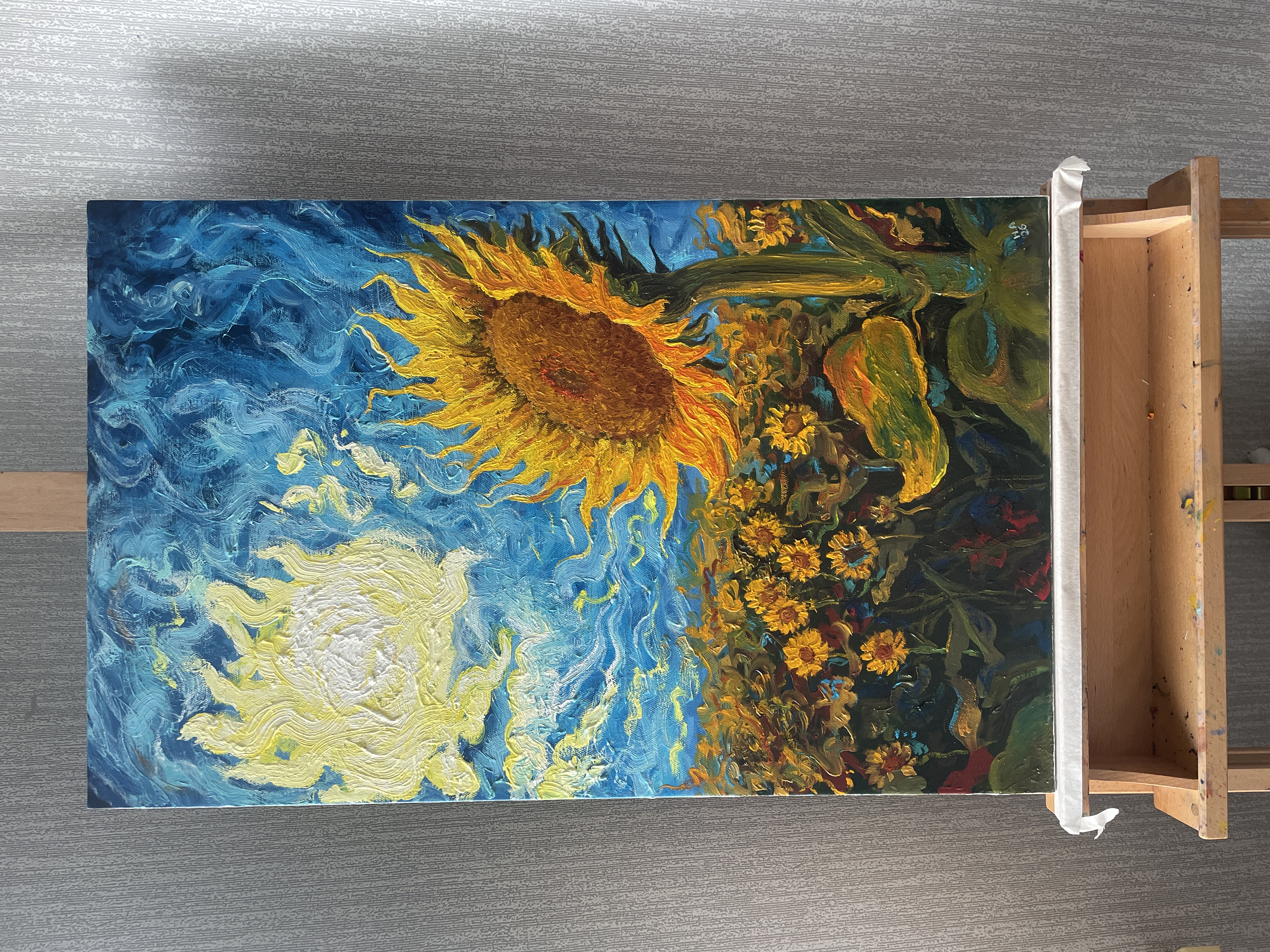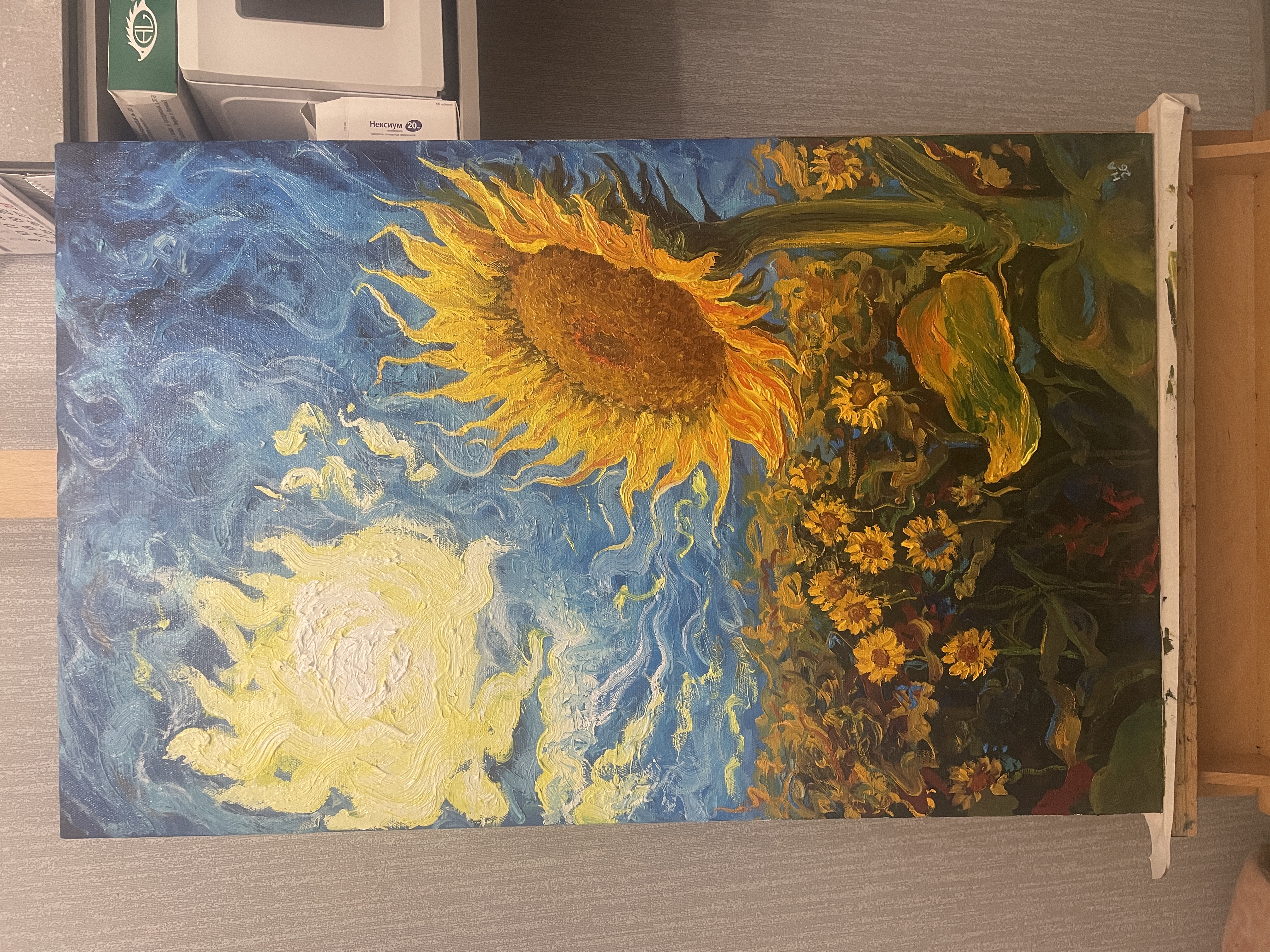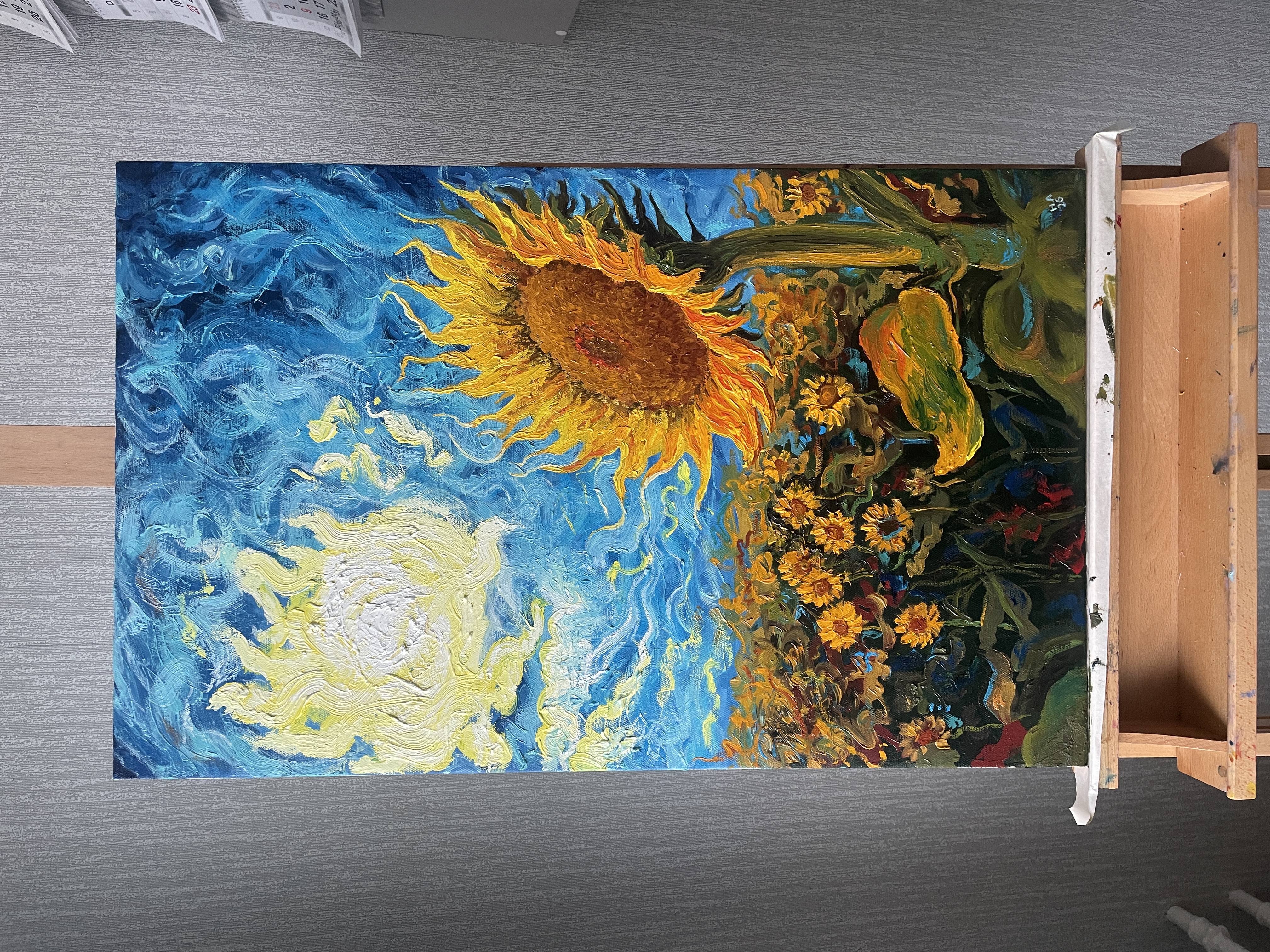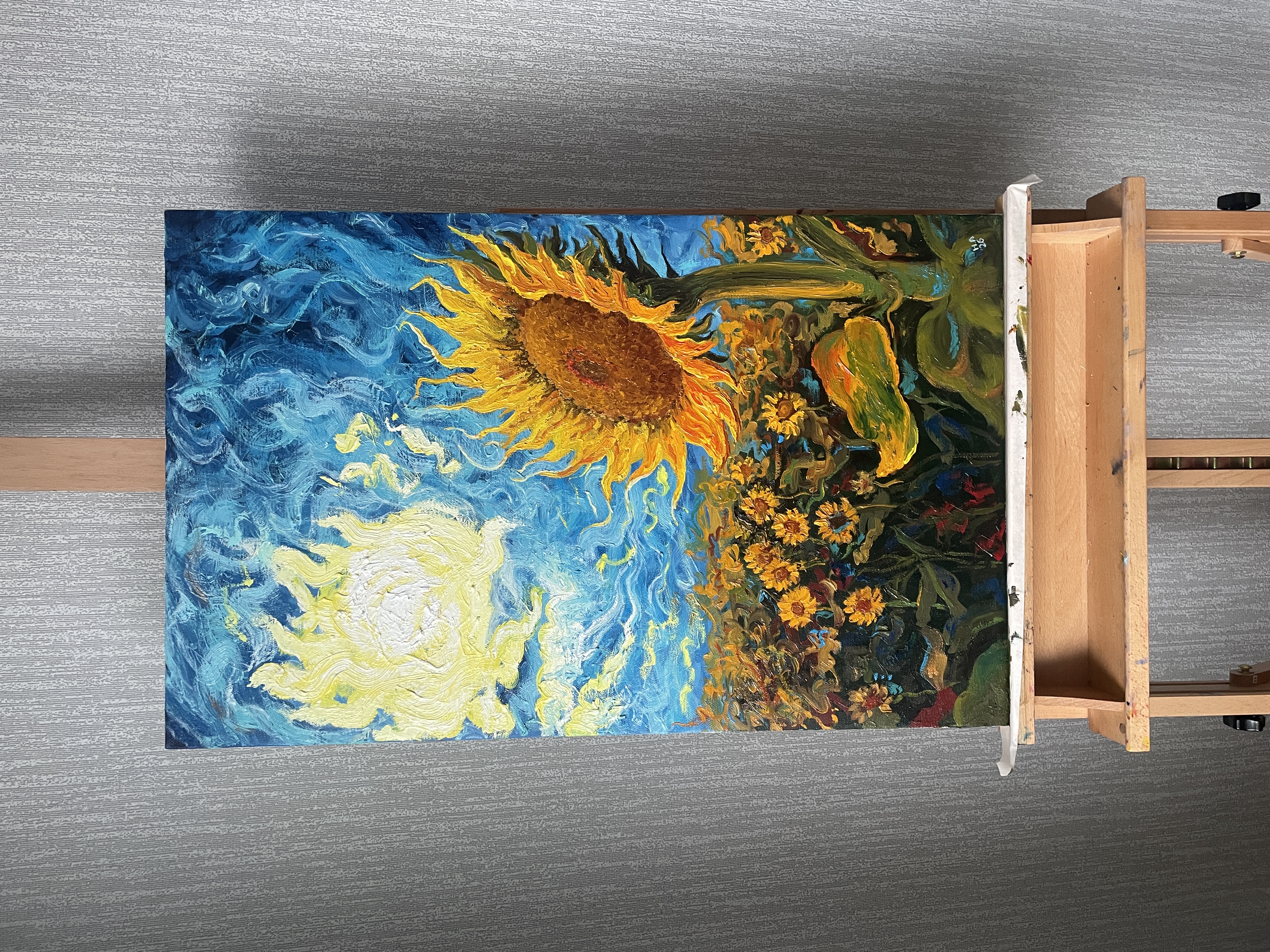 В данной работе сплошной день солнца - как одного небесного светила, так и целого поля подсолнухов. Они тянутся друг к другу и освещают собой всё вокруг. Вся атмосфера пребывает в непрерывном движении, будто дышит своей жизнью и позволила нам себя лицезреть.