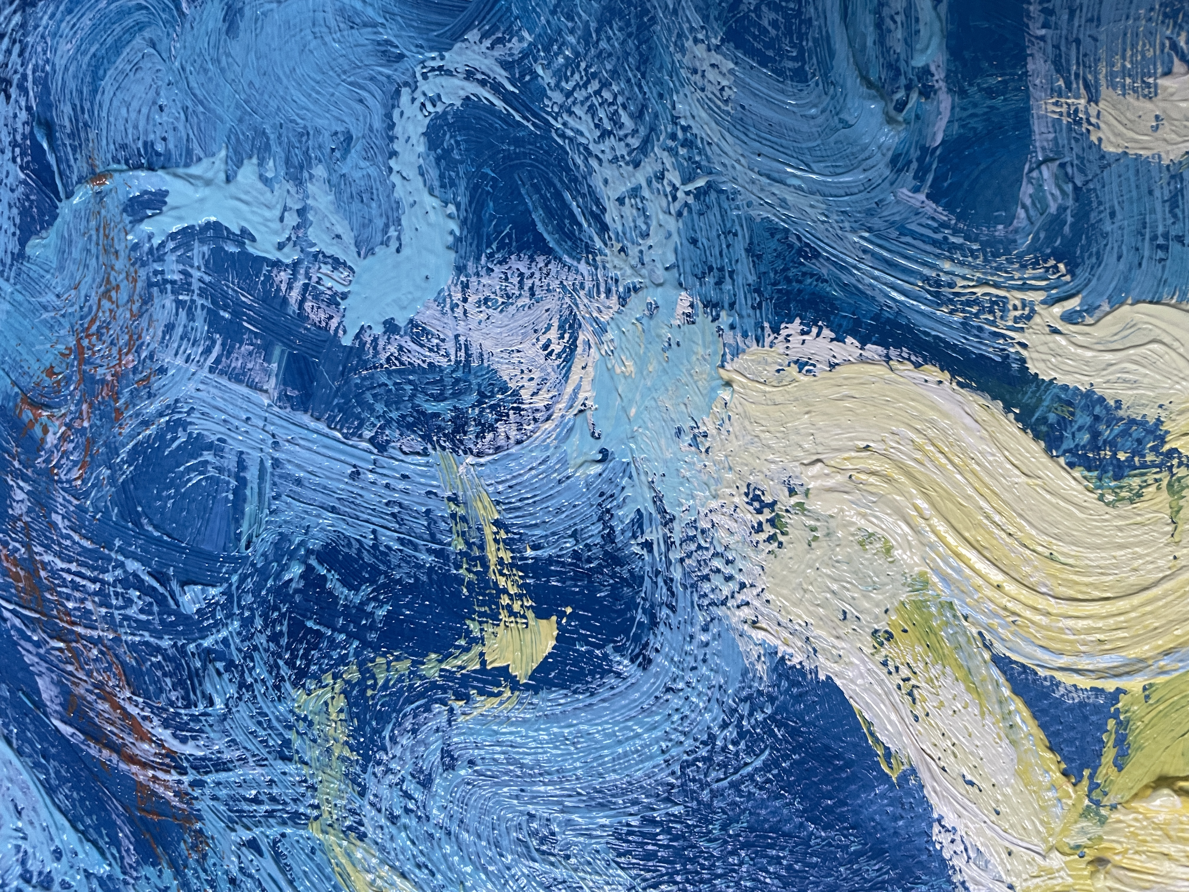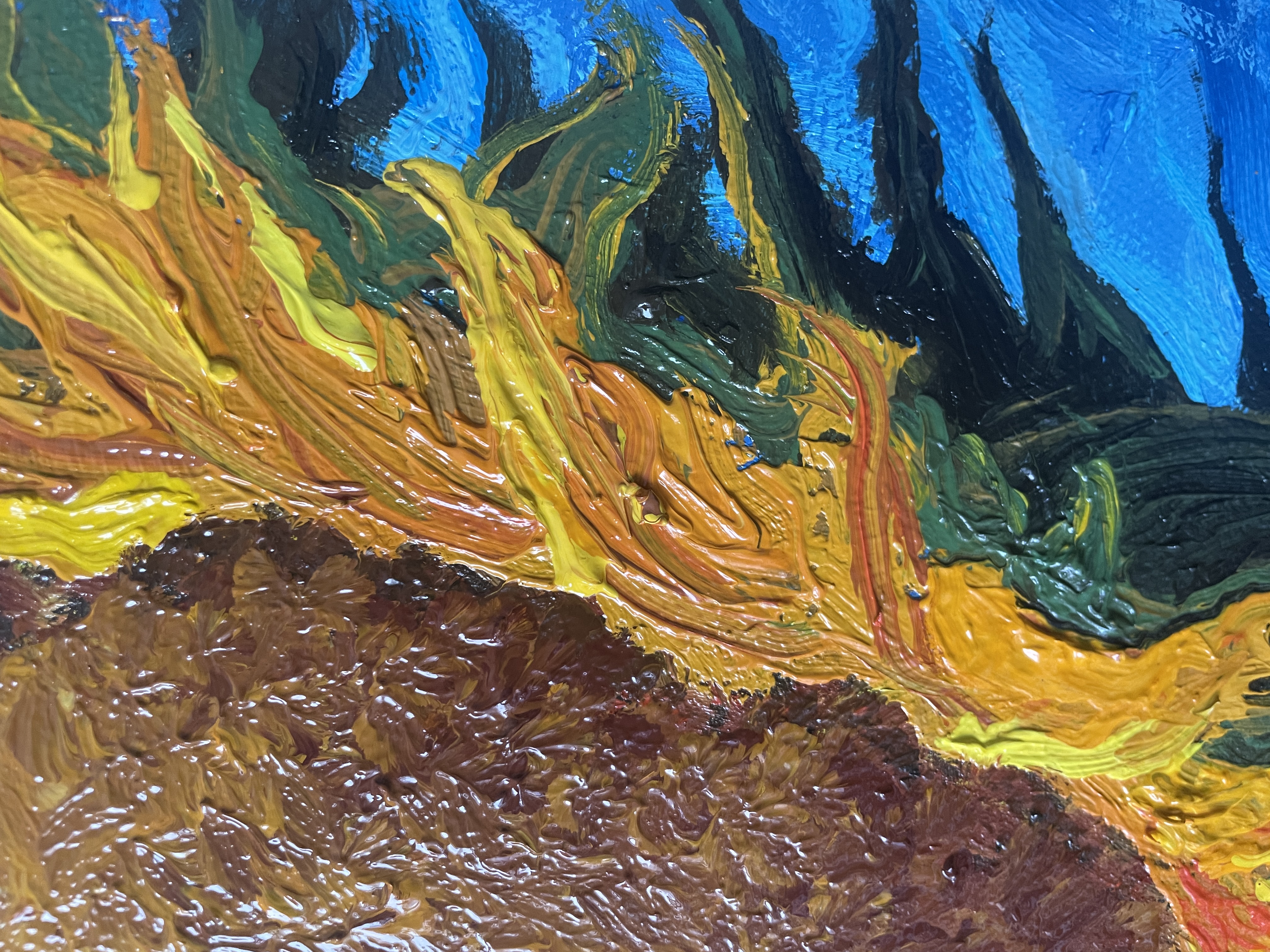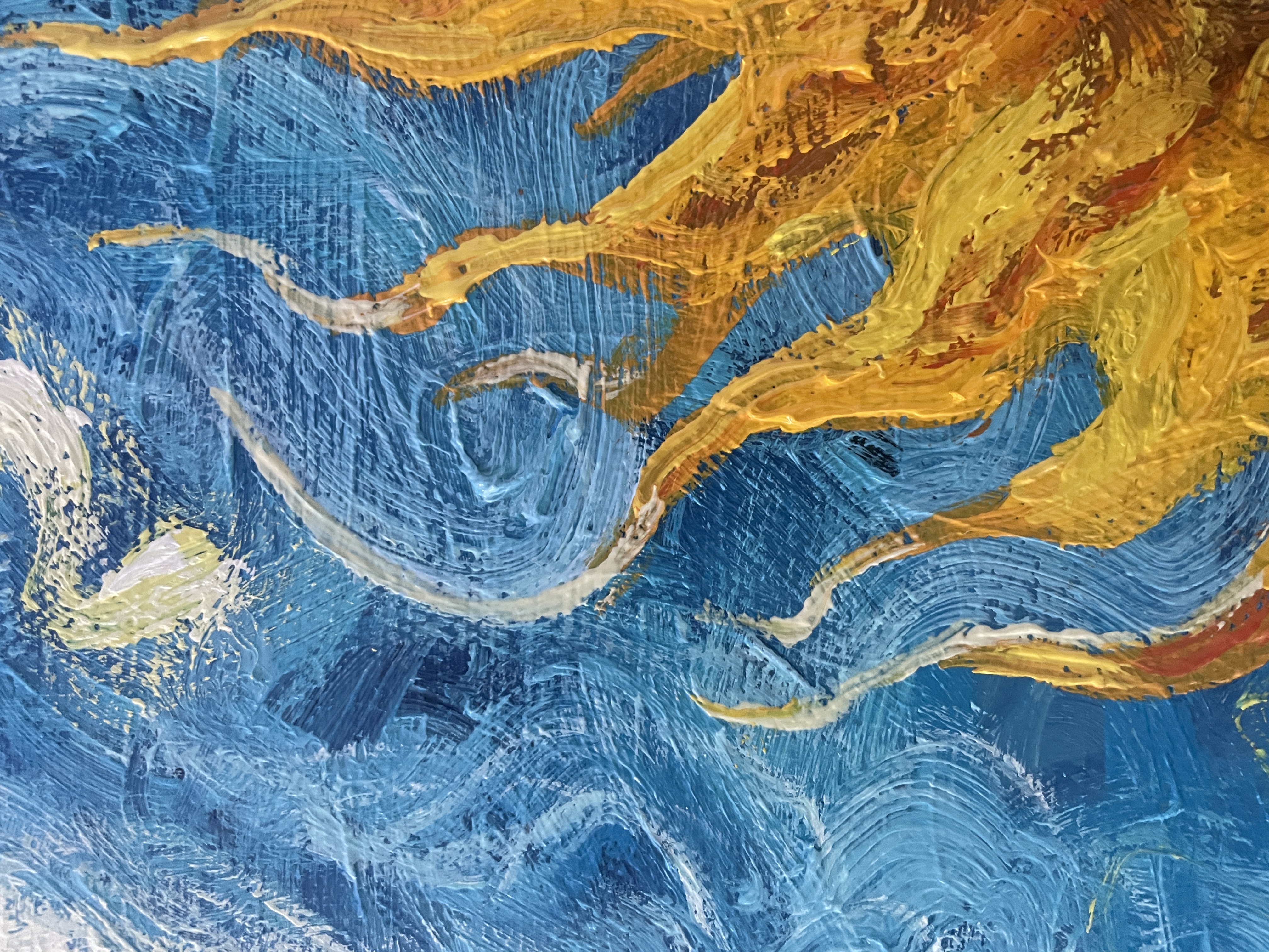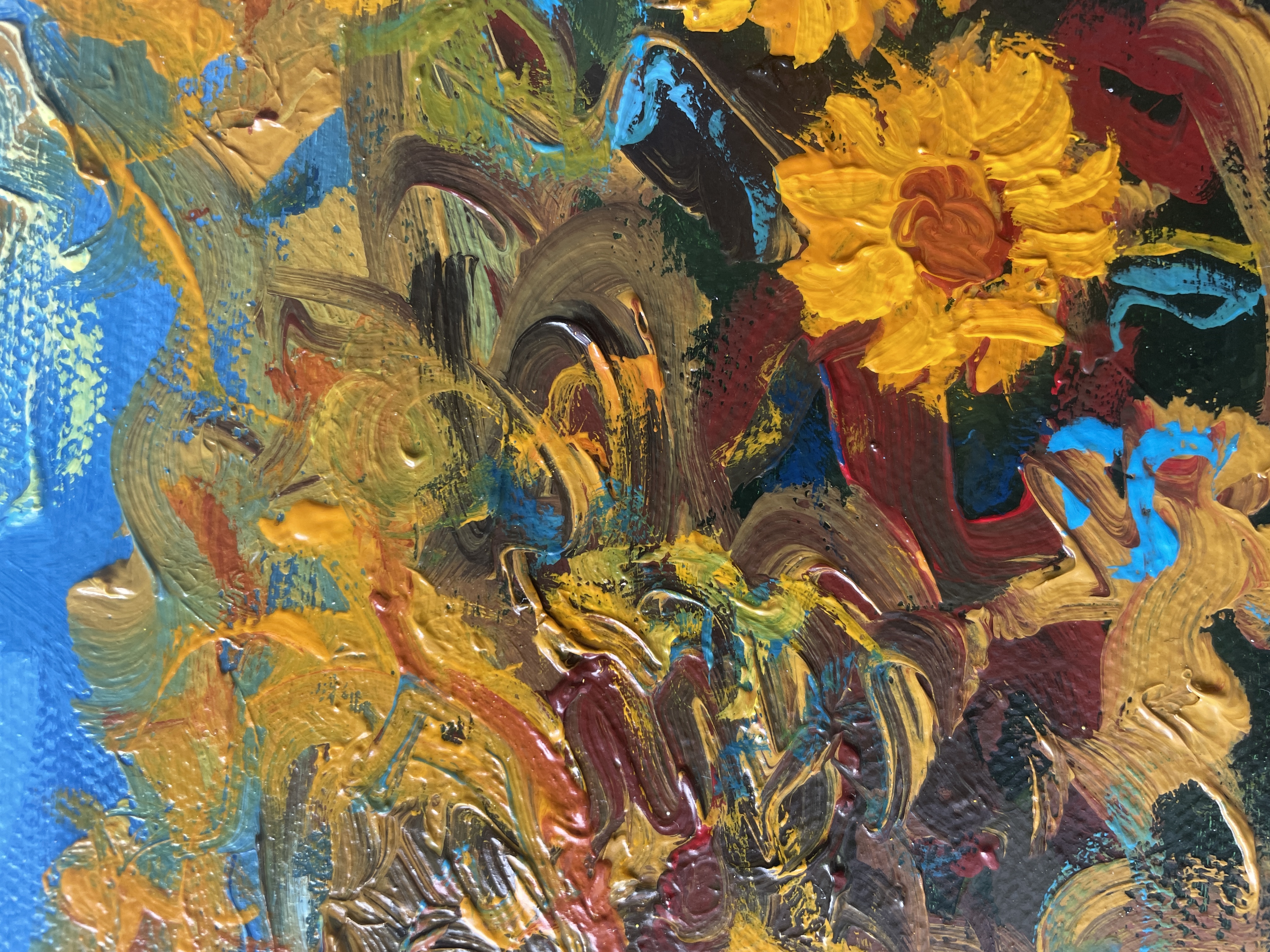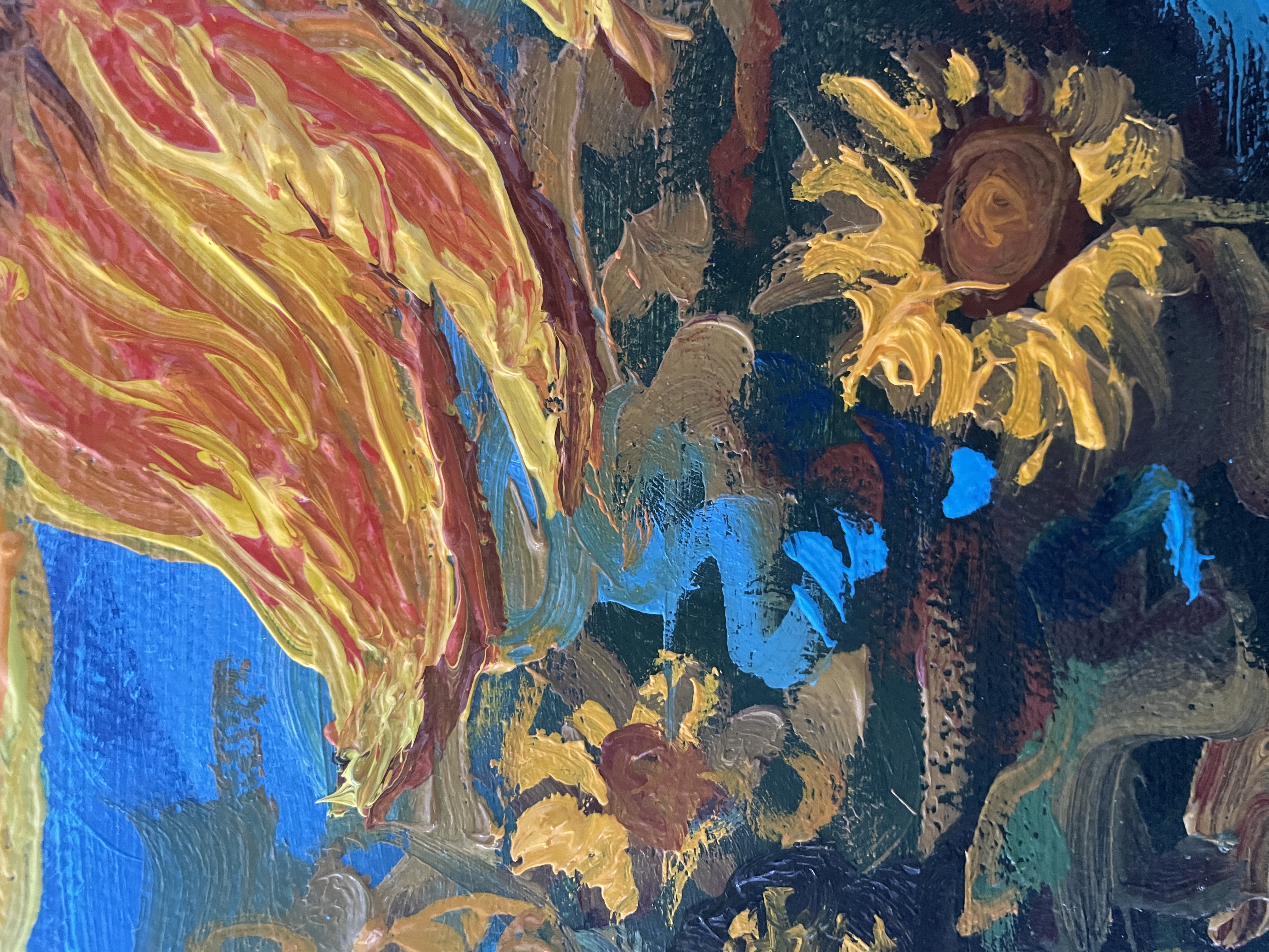 В данной работе сплошной день солнца - как одного небесного светила, так и целого поля подсолнухов. Они тянутся друг к другу и освещают собой всё вокруг. Вся атмосфера пребывает в непрерывном движении, будто дышит своей жизнью и позволила нам себя лицезреть.